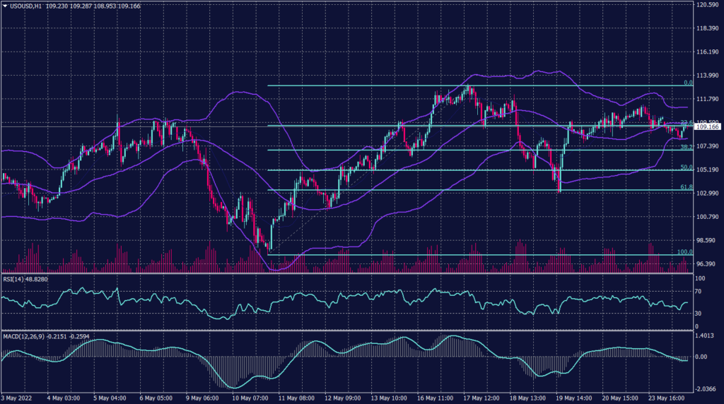 On the hourly chart, the crude shows support at $107.10 and resistance below $111.30. Technical indicators show a possibility to see crude oil lower at $107. However, Fibonacci retracement and 20 periods moving average show a higher probability of continuing climbing.