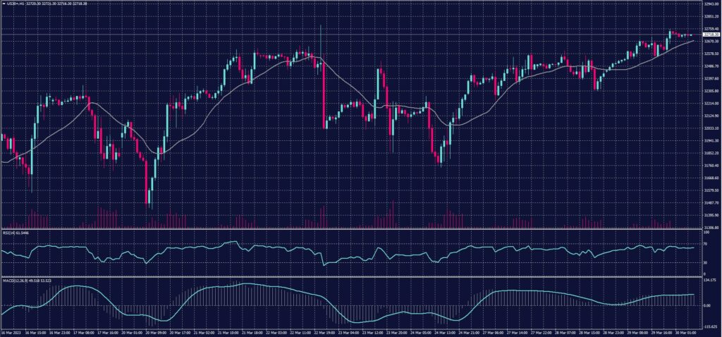 The Dow Jones index rose by 1%, or the equivalent of 323 points, surpassing 32,700 points, achieving its highest closing in 3 weeks.