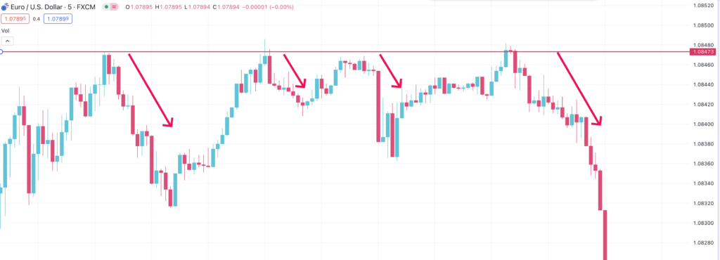 ระดับ resistance คือระดับราคาที่สินทรัพย์มีความเป็นไปได้ยากที่จะกลับขึ้นไป ในกราฟ EUR/USD ขึ้นไปที่ 1.08473 และมีความยากที่จะขึ้นไปต่อ ระดับนี้กลายเป็นระดับ resistance และให้นักเทรดสัญญาณการขายเมื่อราคาถึงที่ 1.08473
