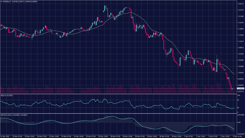 من الناحية الفنية، لا يزال الزوج تحت الضغط ويتجه لكسر مستوى الدعم عند 6.95. ومع ذلك، لا يظهر الرسم البياني اليومي والرسم البياني للساعة إشارات ملحوظة للارتداد حيث تظهر المؤشرات الفنية ضغوطاً بيعة متزايدة.