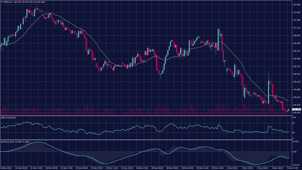 انخفض مؤشر الدولار بنسبة 0.18٪ إلى 104.28 ليسجل أدنى مستوى له منذ 28 يونيو. ومن المتوقع أن يرفع الاحتياطي الفيدرالي أسعار الفائدة بمقدار 50 نقطة أساس إضافية في الاجتماع القادم. هذا وهبط المؤشر بنسبة 1.4٪ الأسبوع الماضي منهيا أسوأ شهر له منذ عام 2010 بسبب تزايد التوقعات بأن الاحتياطي الفيدرالي سيخفض وتيرة رفع أسعار الفائدة.