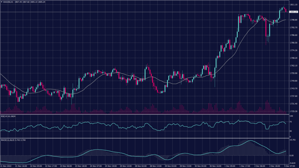 بدأ الذهب أسبوعه بشكل ثابت على الرغم من البيانات الاقتصادية القوية التي تشير إلى احتمالية رفع أسعار الفائدة ومتابعة وتيرة التشديد. حيث نمت الوظائف في القطاعات غير الزراعية في الولايات المتحدة أكثر من المتوقع في نوفمبر، ولكن يبدو أن الأسواق ملتزمة برؤية الاحتياطي الفيدرالي لوتيرة تشديد أبطأ في الأشهر المقبلة. وارتفع الذهب في التداولات الفورية بنسبة 0.1٪ إلى 1,800.10 دولار للأونصة، بينما ارتفعت العقود الآجلة للذهب بنسبة 0.2٪ إلى 1,813.40 دولار للأوقية.