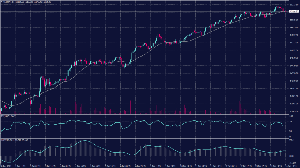 انطلق مؤشر داكس الألماني الى اعلى مستويات 15,100 وقد ارتفعت قيمة المؤشر بأكثر من 3.30% في تداولات الأسبوع الماضي مع ارتفاع شهية المخاطرة لدى المستثمرين وتراجع مستوى التضخم عالميا لا سيما في دول الاتحاد الأوروبي والولايات المتحدة الامريكية كما أظهرت البيانات خلال الأسبوع الماضي ، وينتظر السوق مؤشر اسعار المستهلكين الالماني يوم الثلاثاء القادم للتأكد من صحة الاقتصاد الألماني والحصول على ملامح وجهة المركزي الأوروبي بشأن أسعار الفائدة.