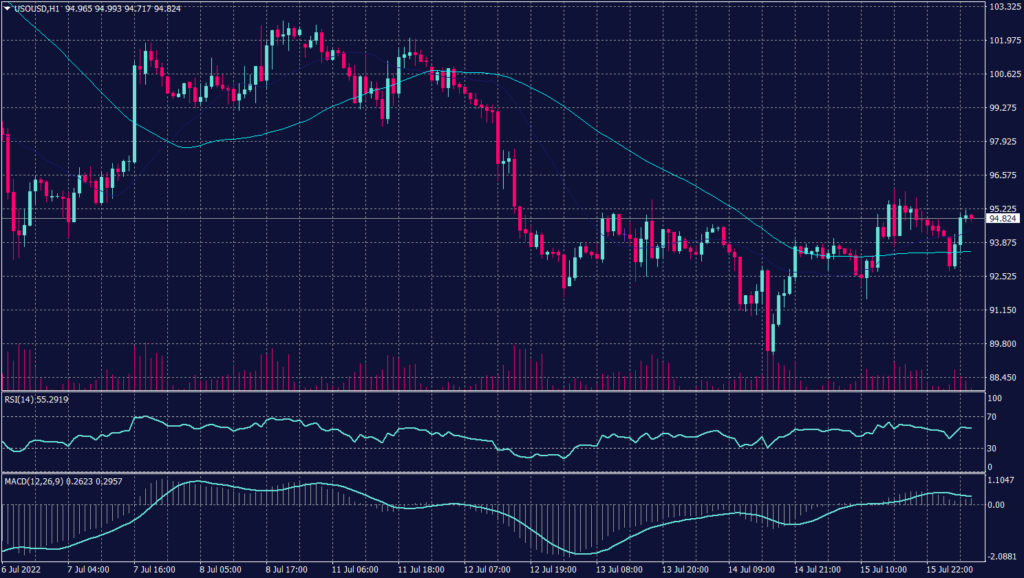 WTI Crude is settling above the support at $92.50 a barrel for the first time since April, as gains were limited by a U.S. supply report showing rising inventories and caution ahead of U.S. inflation data. On the hourly chart, WTI prices show a decrease in volume traded due to the worries about global growth and consumption.