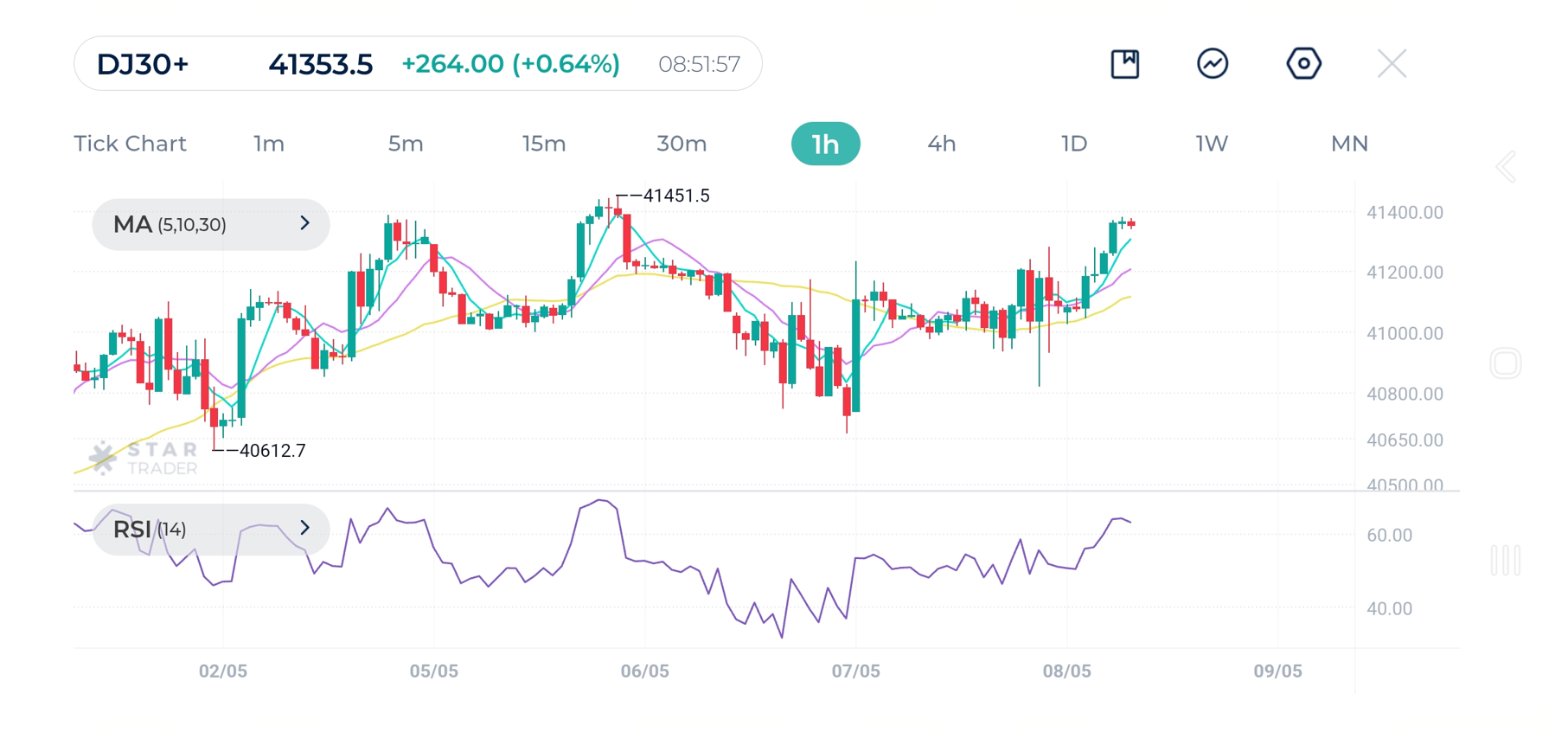 Dow Jones Industrial Average shows bullish momentum today with all short term and mid term moving averages trending upward on the hourly chart. The index might face resistance at the 41,451 level, which represents the monthly high.