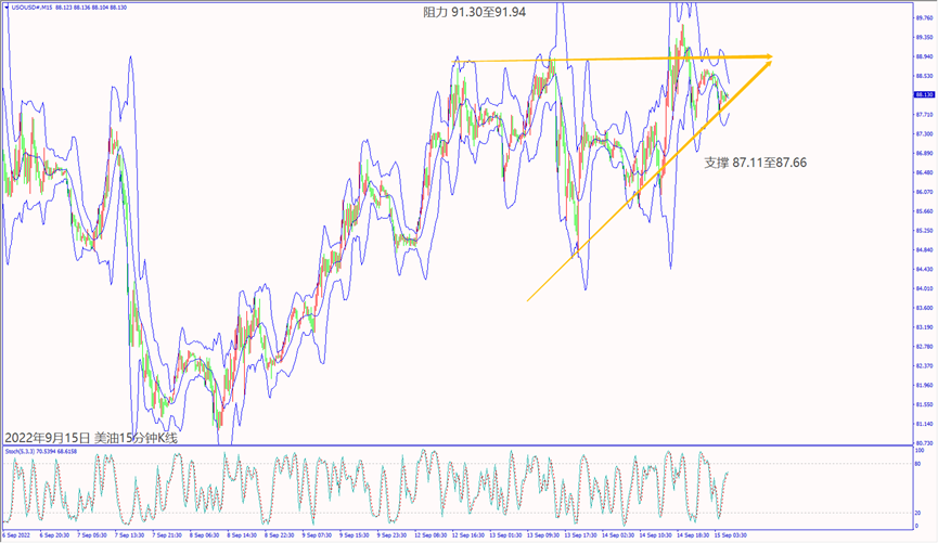 昨天(14日)欧盟官员表示正在讨论天然气价格上限,以及提出中小企业的救济计划,利好德指从当日低点上涨约150个点。欧盟经济学家表示持续加息抑制通胀,以及惠誉机构预测欧元区将在今年晚些时候进入衰退,造成德指反转大跌逾250点,拖累道琼斯和纳指皆下跌约1%。IEA月度原油报告调降2022年石油需求,一度造成美油价格回测86.00关口。俄罗斯大使表示石油价格上限无法抑制国际原油报价,市场扎空买盘带动美油价格逆势上涨逾4%。美国公布EIA原油库存和精炼油库存高于市场预期,造成美油价格回落至88美元附近整理。