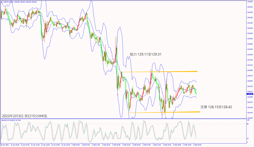 日级别线图,长下影线阴烛,守住128.00关口,可能上看5日均线;15分钟K线,短线区间震荡,一旦突破下降趋势线,有机会挑战起跌阻力。
