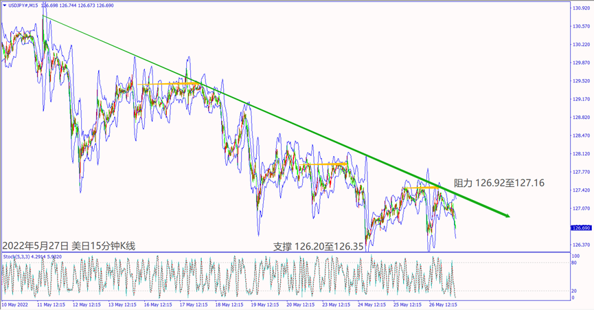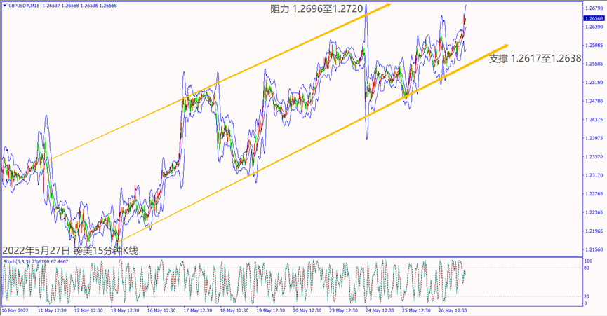 昨天(26日)日本首相岸田文雄称将从6月10日起恢复国外游客入境利好日元,美日冲不过小时布林带中轨127.09,建议可偏空操作。昨天英国财政大臣称将引入投资税激励措施有望利好英镑,镑美守住小时布林带中轨1.2604,建议可短多操作。预期今天(27日)美国公布经济数据大都不佳恐利淡美元,欧美守住小时布林带中轨1.0726,建议可短多操作。
