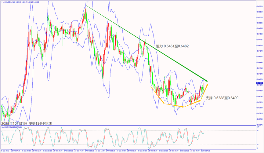 日级别线图,连2阴修正KD多方过热,守住30日均线,有望维持多方格局;15分钟K线,圆形底反转,一旦突破下降趋势线,有机会挑战前高阻力。