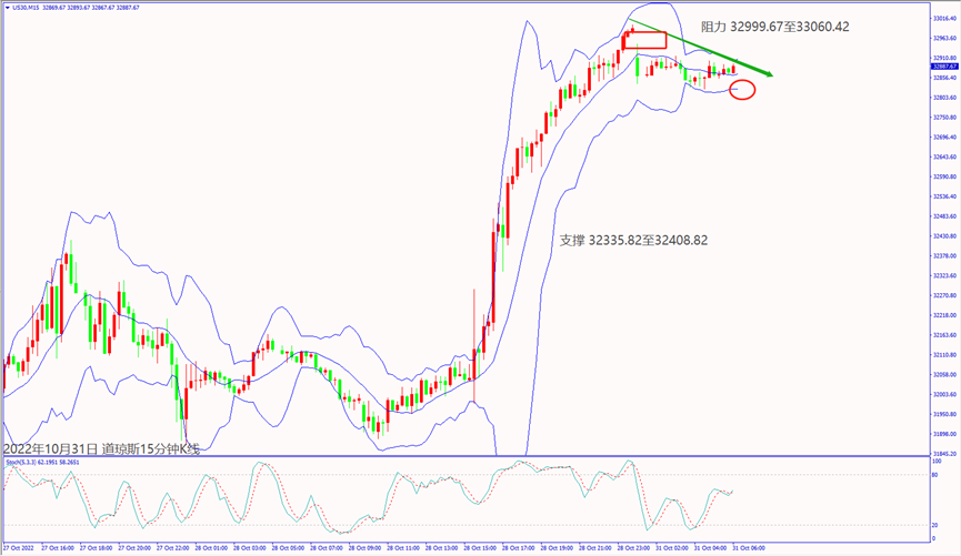 上周五(28日)美国公布PCE物价利淡加息,道琼斯和纳指扩大上涨超3%。预期今天(31日)欧元区公布CPI数据攀升利淡股指,德指一旦跌破小时布林带中轨13,286,建议可短空操作。预期今天美国公布经济数据利好股指,道琼斯若守住小时布林带下轨线32,709,建议可短多操作。