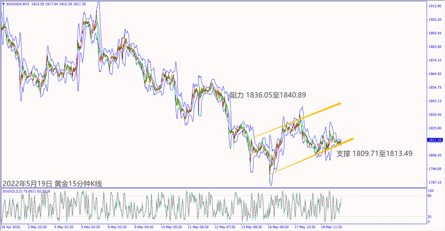 日级别线图,近期在1800关口上方盘底,一旦突破5日均线,有机会出现涨势;15分钟K线,短线出现上升矩形,守住趋势线,大有可能挑战前高阻力。