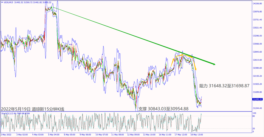 昨天(18日)通胀隐忧和美国新冠疫情稳定增长,造成道琼斯和纳指崩跌近5%。预期今天(19日)欧洲央行货币会议纪要偏向鹰派,德指冲不过小时布林带中轨13,885,建议可偏空操作。预期今天美国公布经济数据大都不佳,道琼斯冲不过小时布林带上轨线31,528,建议可偏空操作。