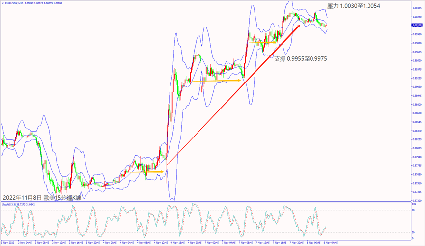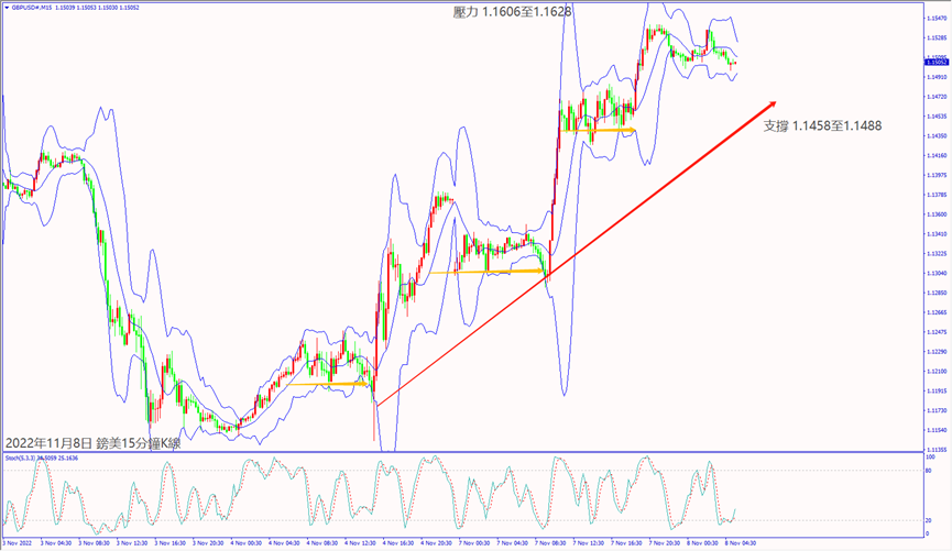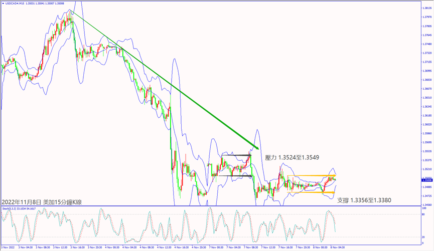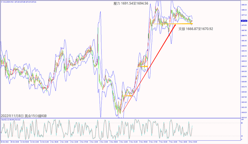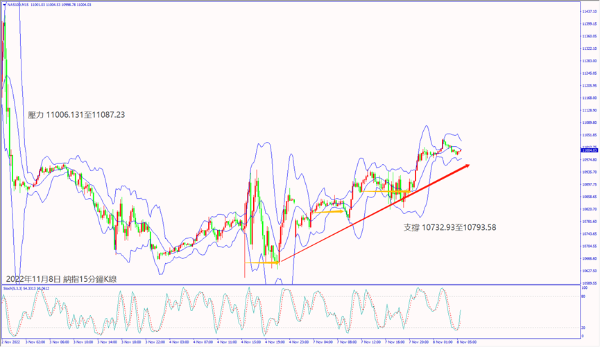 昨天(7日)市場預期參眾議院由共和黨獲得多數席次恐影響美聯儲加息,利好道瓊斯和納指擴大上漲逾2%。預期今天(8日)瑞士央行行長重申加息抑制通脹,德指若摜破小時布林帶下軌線13,496,建議可短空操作。預期今天市場對美國參眾議院選舉結果恐影響拜登經濟政策利淡股指,納指一旦跌破小時布林帶中軌10,962,建議可短空操作。
