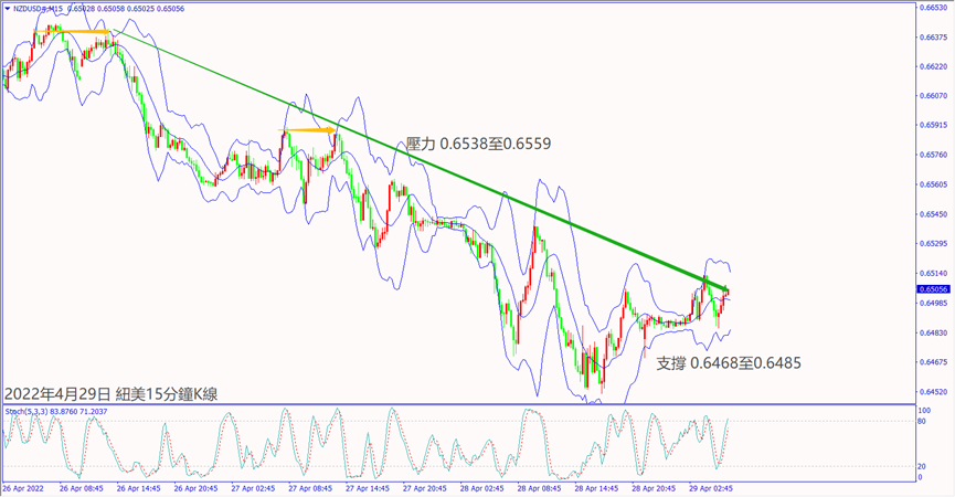 日級別線圖,長下影線黑K,KD出現金叉,可能出現反彈;15分鐘K線,短線形成盤跌,一旦突破下降趨勢線,大有可能挑戰起跌壓力。