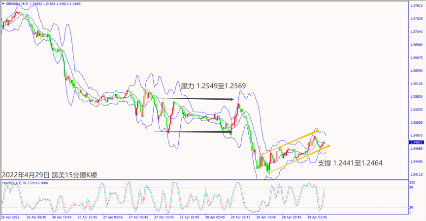日級別線圖,長下影線黑K,KD空方鈍化,可能止跌反彈;15分鐘K線,短線出現上升楔形,前波盤整底部若突破,大有可能挑戰前高壓力。