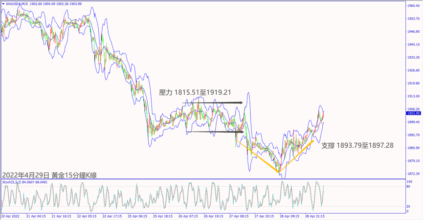 昨天(28日)德國議會通過對烏援助重武器,加上美元高點回落,推升黃金價格衝高至1890關口。預期今天(29日)美國公佈經濟數據大都不佳可能利淡股指下跌,黃金價格若突破1900關口,建議可短多操作。