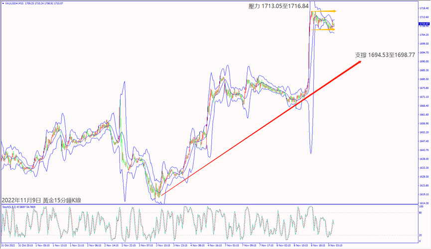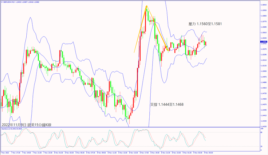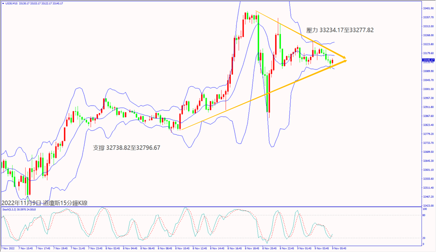 昨天(8日)美國公佈經濟數據不佳,市場樂觀美國中期選舉利好經濟,帶動道瓊斯和納指擴大上漲近2%。預期今天(9日)瑞典央行行長重申加息抑制通脹,德指沖不過小時布林帶上軌線13,721,建議可短空操作。預期今天多位美聯儲官員表示維持加息,道瓊斯一旦摜破小時布林帶下軌線33,072,建議可短空操作。