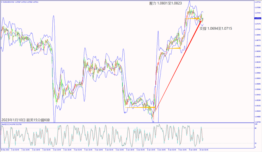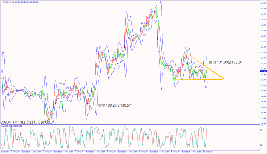 昨天(9日)多位美聯儲官員重申加息抑制通脹,利淡道瓊斯和納指皆跌逾1%。預期今天(10日)歐洲央行官員重申連續加息抑制通脹,德指一旦摜破小時布林帶下軌線14,665,建議可短空操作。預期今天美聯儲主席鮑威爾重申加息趨緩,道瓊斯若突破小時布林帶中軌33,587,建議可短多操作。